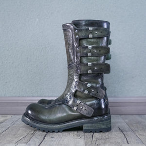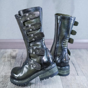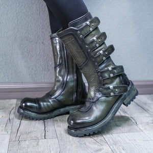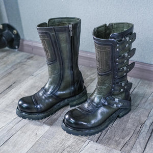 Crafted from high-quality cowhide leather, these boots are available in two striking colors: military green and classic brown. The meticulous craftsmanship and attention to detail are evident in every stitch, ensuring that these boots are not only stylish but also built to last.