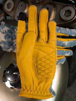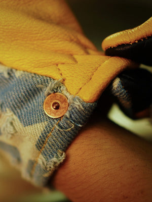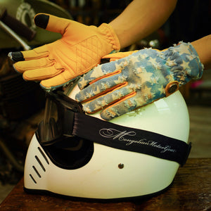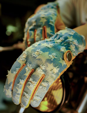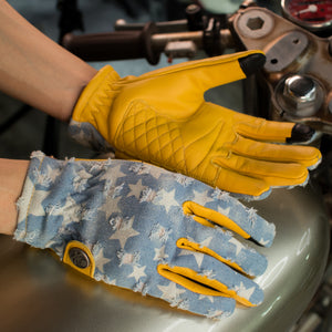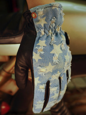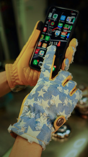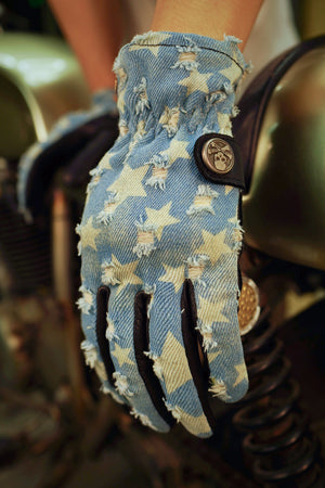 Crafted from a combination of Turkish leather and distressed denim, these gloves embody the spirit of the open road and the freedom that comes with it. The luxurious feel of genuine leather paired with the rugged appeal of denim makes these gloves a must-have for any serious biker.